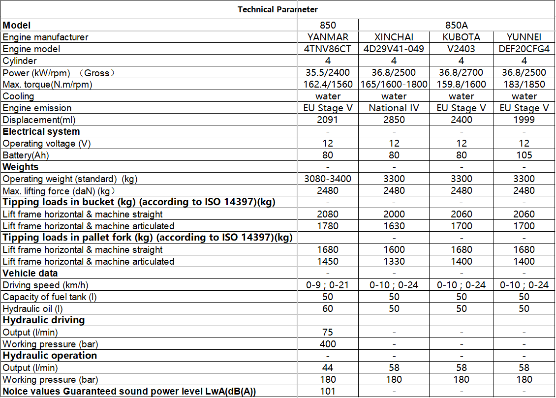 The 850\850A wheel loader is a high-efficiency, compact piece of equipment engineered for versatile light-to-medium-duty operations, powered by a premium KUBOTA engine that delivers a robust 36.8kW of rated power and strictly complies with the stringent EU Stage V emission standard. This top-tier emission compliance is not just an environmental advantage—it eliminates costly regulatory hurdles, emission-related fines, and operational delays, enabling seamless deployment across European markets and other regions with strict eco-regulations, so you can focus on productivity rather than compliance issues. As an articulated front-end loader, it adopts an advanced hydrostatic driving system featuring a simplified mechanical structure with fewer moving parts, which not only cuts down on long-term maintenance needs but also delivers exceptional power performance and ultra-precise speed control for both high-speed material hauling and low-speed, meticulous operations. Ideal for a wide array of applications, this agile loader excels in tasks like orchard fruit transportation, garden soil grading, farm feed and hay handling, and small construction site debris clearing, adapting effortlessly to tight, confined workspaces where larger machinery struggles to maneuver.