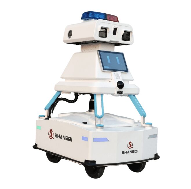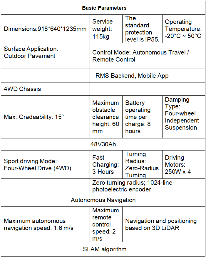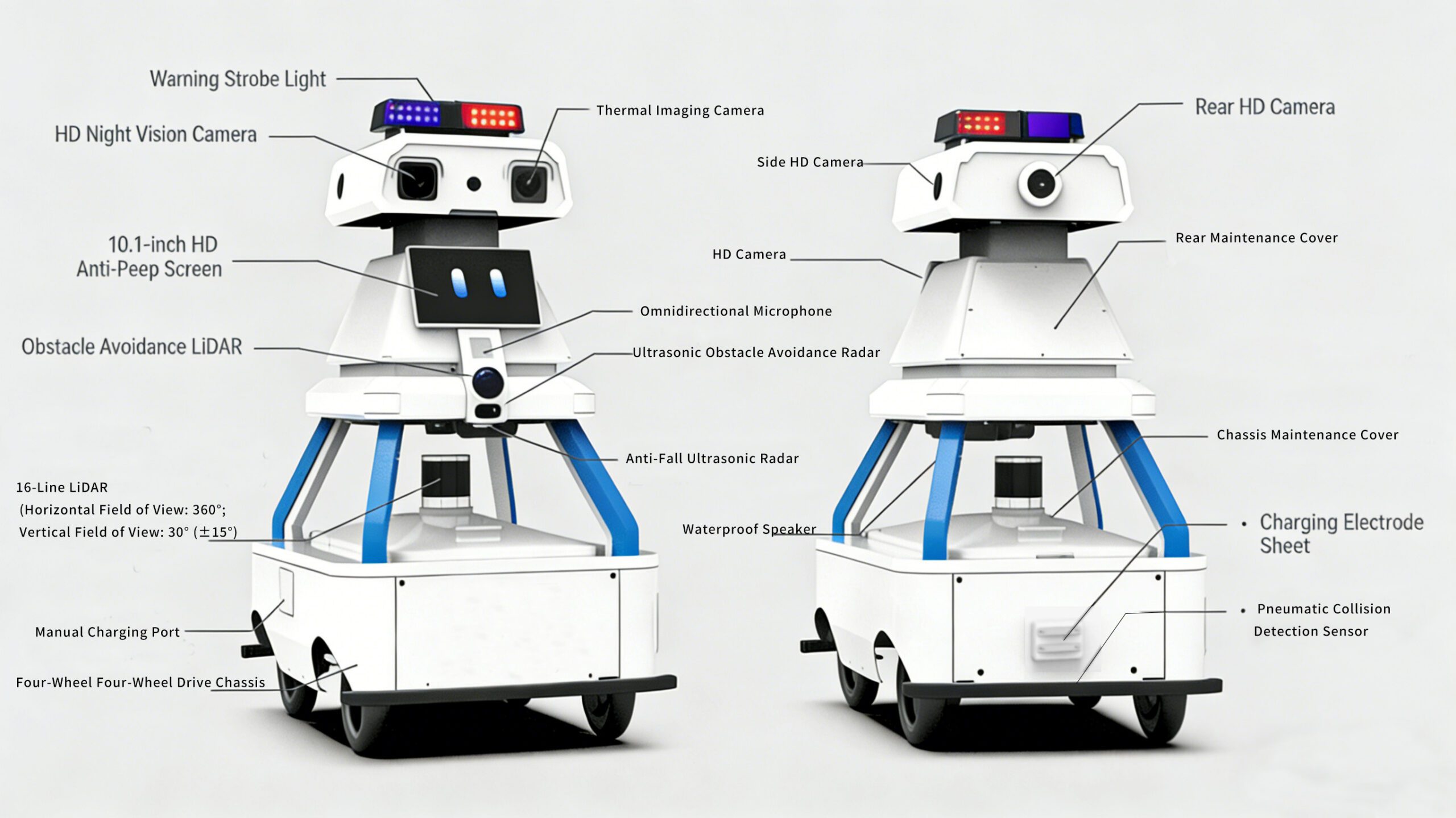 The patrol robot’s complete machine configuration includes an HD night-vision camera, a thermal imaging camera, a rear HD camera, and a side HD camera. It is equipped with a 10.1-inch HD waterproof display, an HD camera, and an omnidirectional microphone for comprehensive perception and monitoring. For obstacle avoidance and environmental sensing, the robot features an obstacle-avoidance LiDAR, an ultrasonic obstacle-avoidance radar, and a 16-channel LiDAR with a horizontal field of view of 360° and a vertical field of view of 30° (±15°). Other key components include a chassis access panel, a manual charging port, an anti-fall ultrasonic radar, and a waterproof speaker. Safety and operational convenience are ensured by an emergency stop button, charging electrode plates, and a pneumatic collision detection sensor. The robot is built on a four-wheel four-wheel-drive (4WD) chassis for stable and reliable movement in various environments.