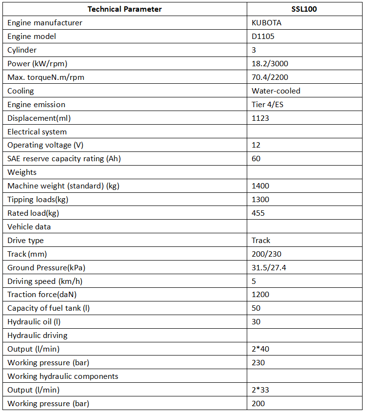 Built to excel in restricted locations where larger machinery cannot access, the SSL100 Skid Steer Loader is ideal for urban infrastructure projects, small construction sites, factory floors, warehouse loading bays, and dockyards. Its short wheelbase enhances dexterity in narrow alleys and tight job sites, while its robust track drive system ensures stable performance on uneven ground and excellent passing ability on undulating terrain. From light-duty landscaping work to heavy-duty construction tasks, this skid steer loader balances power and agility to maximize productivity in every application.