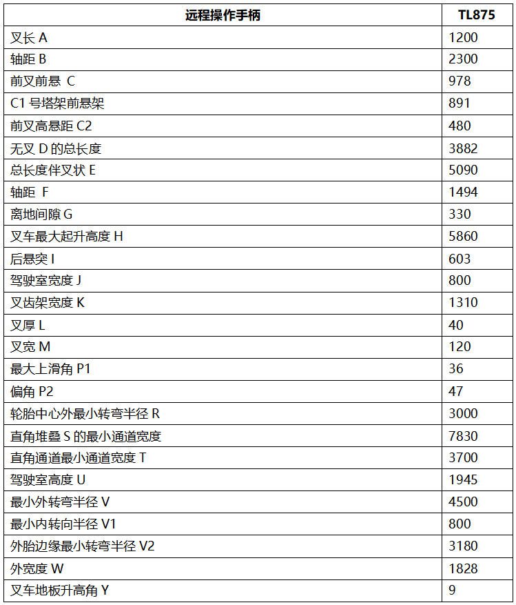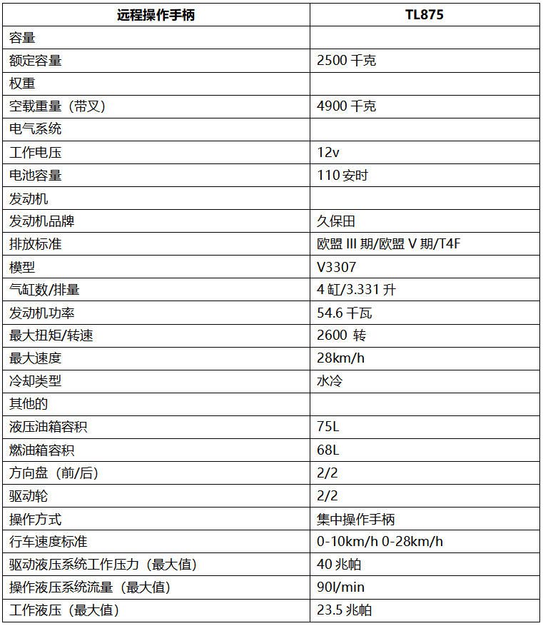 上骐TL875采用久保田EURO5发动机和意大利全液压系统,客舱带加热器或客舱带空调可选。 TL875遥控手柄的载重能力为2.5吨,叉可达5.9米。采用四轮驱动式,有前轮、四轮、蟹式转向等多种转向方式。